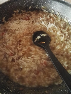 Dopo circa 18 minuti il riso sarà pronto. Controllare prima se la cottura sarà terminata; a quel punto spegnere il fuoco, aggiungere una noce di burro e il Parmigiano grattugiato, mescolare e lasciare mantecare. (6)